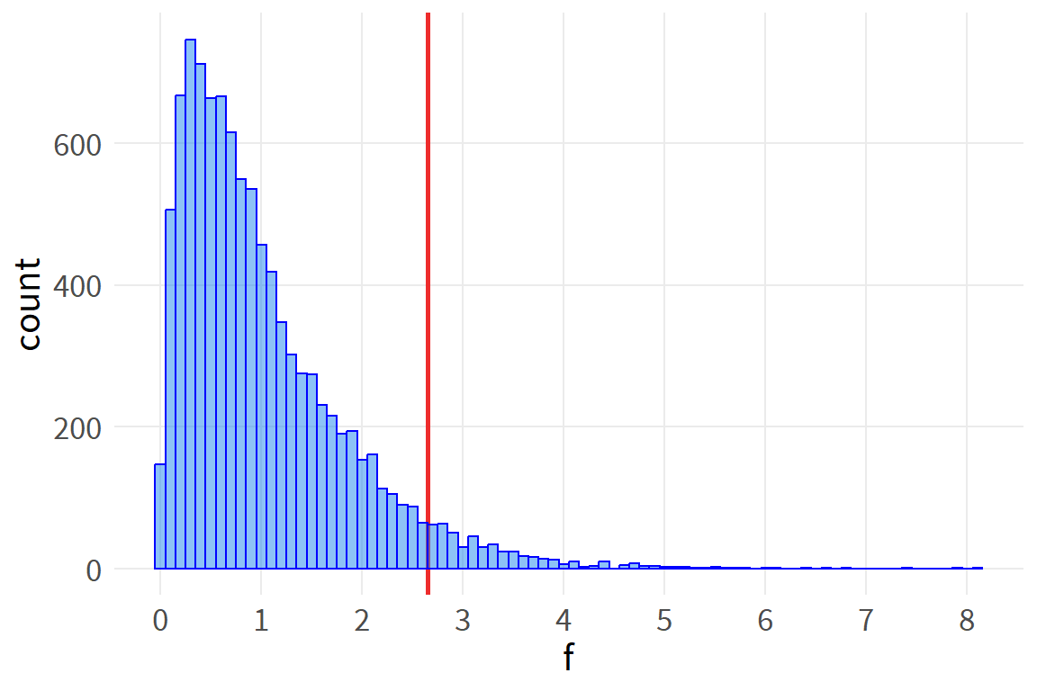We can use R’s built in functions to generate the critical value of the F distribution, as well as the probability (p-value) of observing the actual value under the null hypothesis.