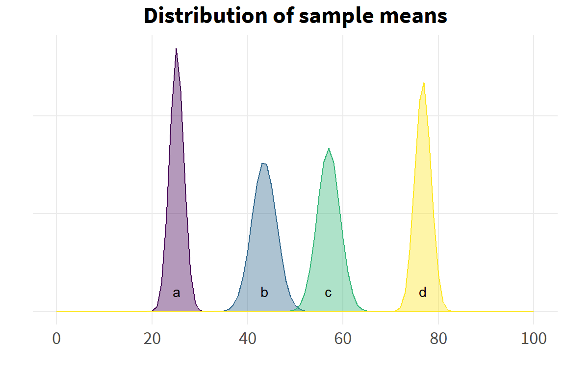 # distribution of sample means ---- ggplot() +stat_function(fun = dnorm, args=list(mean=d_mns$grp_mn[1],sd=d_mns$se[1]),geom ="polygon",color = col[1], fill = col[1], alpha =0.4) +stat_function(fun = dnorm, args=list(mean=d_mns$grp_mn[2],sd=d_mns$se[2]),geom ="polygon",color = col[2], fill = col[2], alpha =0.4) +stat_function(fun = dnorm, args=list(mean=d_mns$grp_mn[3],sd=d_mns$se[3]),geom ="polygon",color = col[3], fill = col[3], alpha =0.4) +stat_function(fun = dnorm, args=list(mean=d_mns$grp_mn[4],sd=d_mns$se[4]),geom ="polygon",color = col[4], fill = col[4], alpha =0.4) +scale_x_continuous(limits=c(0,100),breaks=seq(0,100,20)) +theme(axis.text.y=element_blank()) +labs(x="",y="",title="Distribution of sample means") +annotate("text", x=c(25.1, 43.5, 57, 76.7), y=.021, label=letters[1:4])