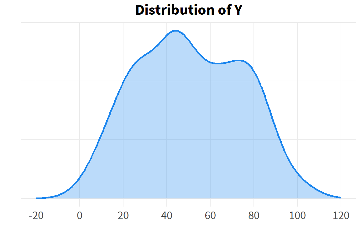 # distribution of overall data Ydens_y <-ggplot(d, aes(x=y)) +geom_density(alpha=.3, fill="dodgerblue2", color="dodgerblue2", linewidth=1) +scale_x_continuous(limits=c(-20,120),breaks=seq(-20, 120, 20)) +theme(axis.text.y=element_blank()) +labs(x="",y="",title="Distribution of Y")dens_y