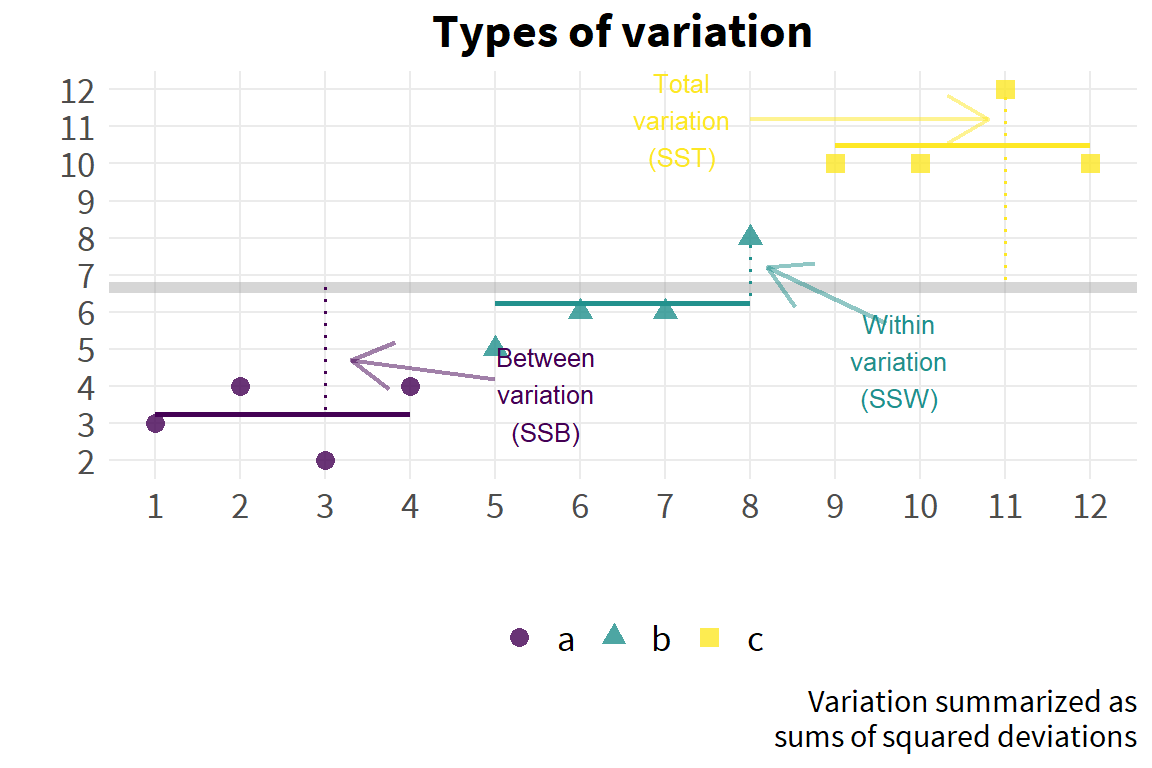 The key here is the variance term. If the sub-group means differ, their means will have a variance around the grand mean. If this ‘between’ variance of the sub-group means around the grand mean is large relative to the ‘within’ variance of group observations around the group mean (which by assumption would just be \(\sigma^2\) for each sub-group), then we have evidence that the group means do in fact differ from the grand mean.